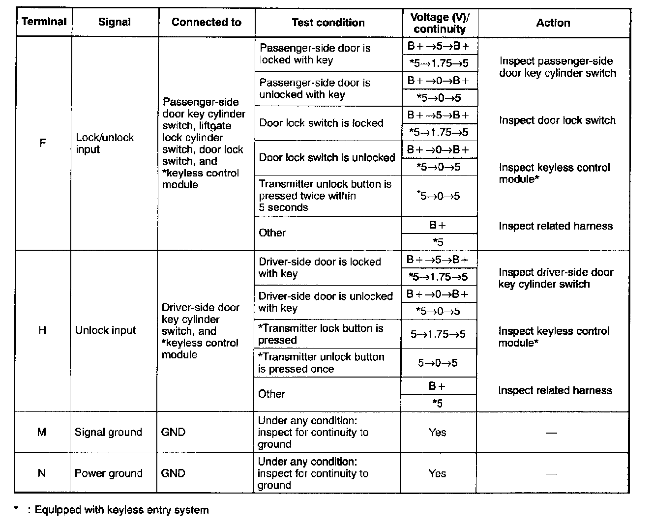 - If not as specified, inspect the parts listed under "Action" and the related wiring harnesses.