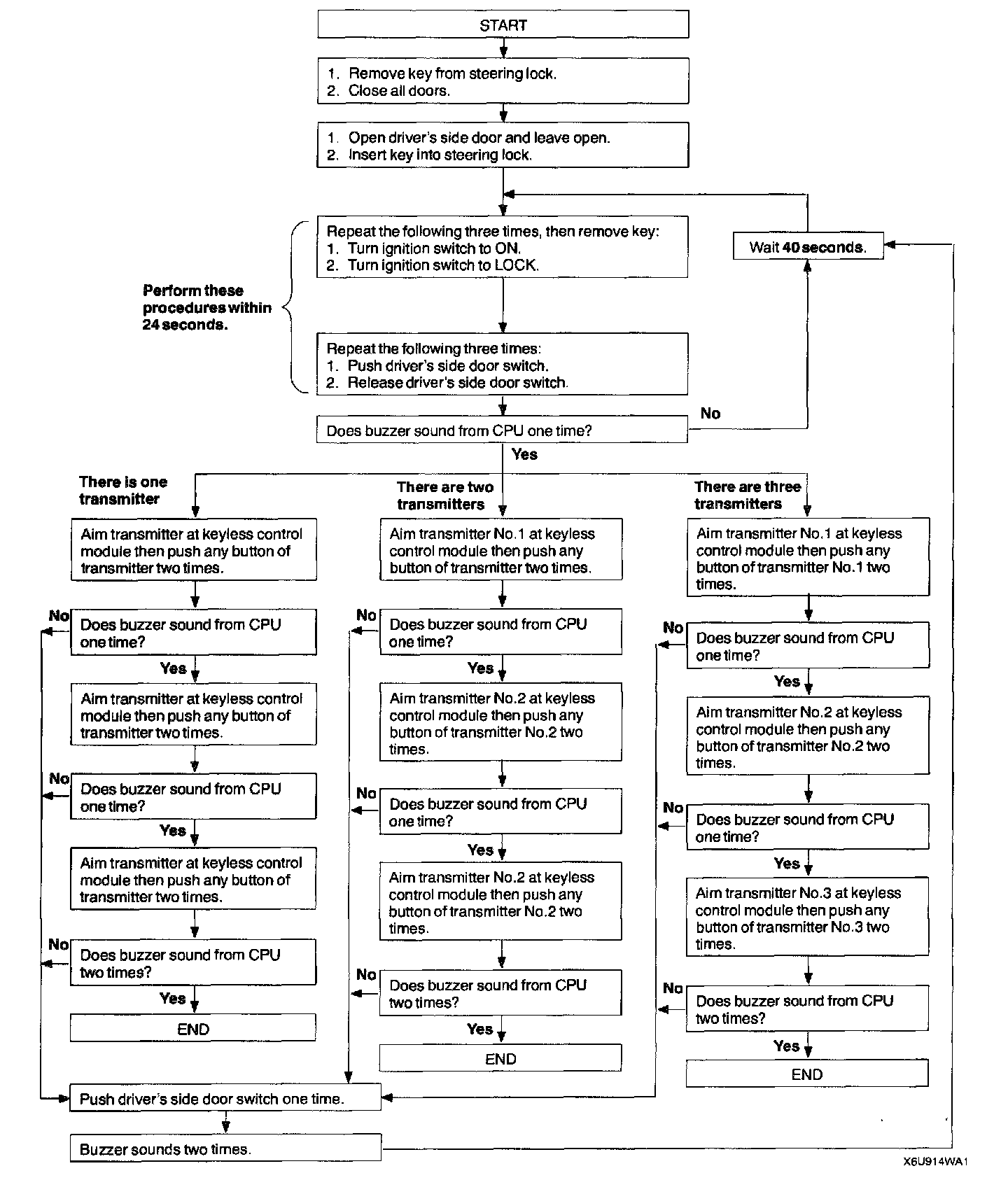 CAUTION: Because up to three ID codes can be programmed into the keyless control module, the vehicle may be stolen with the ID code of an unused transmitter. In order to prevent this, the ID codes for all three transmitters must be reprogrammed when reprogramming an ID code. Also, when one or two transmitters are used, the ID code must be programmed three times with the same transmitter.