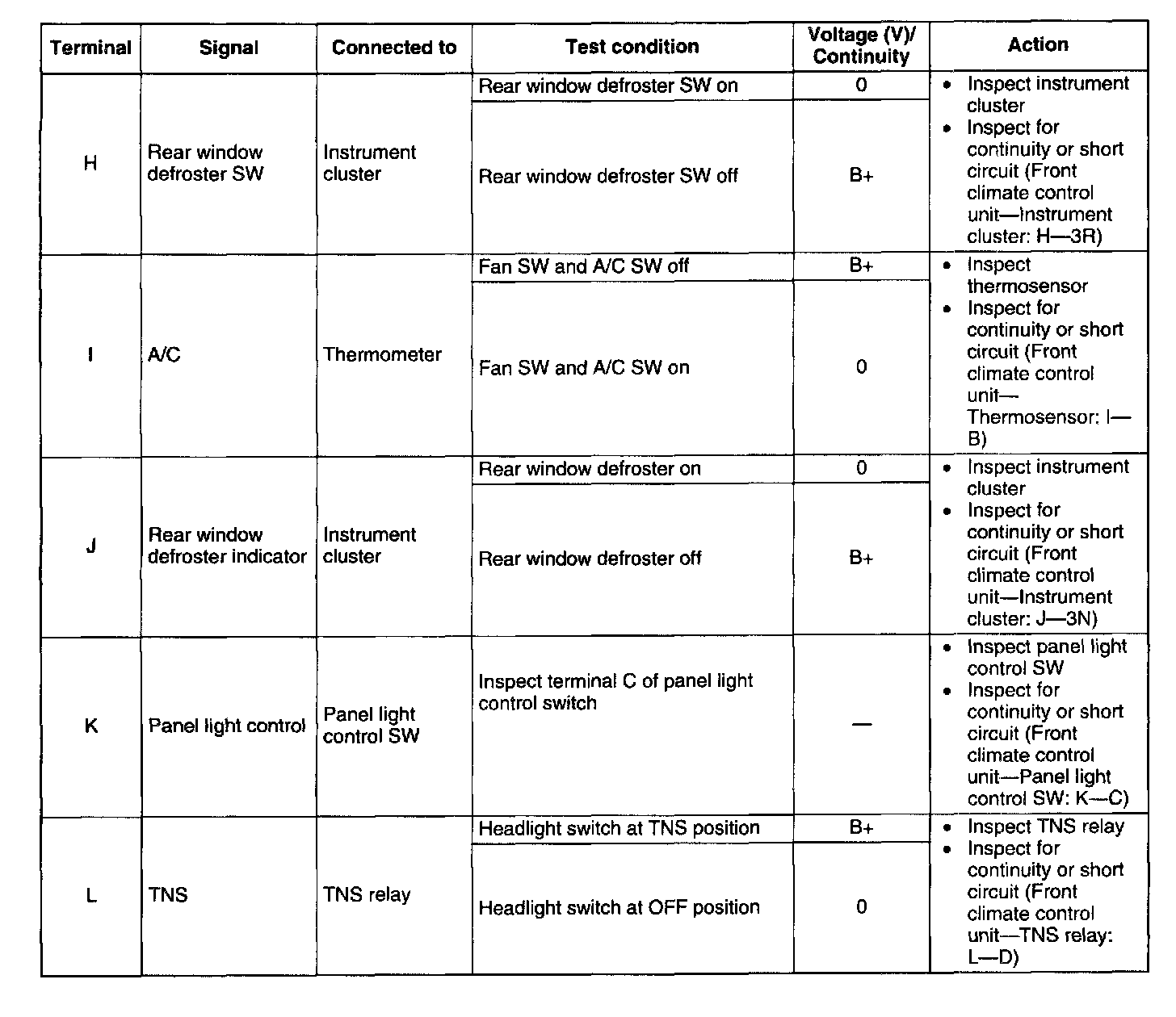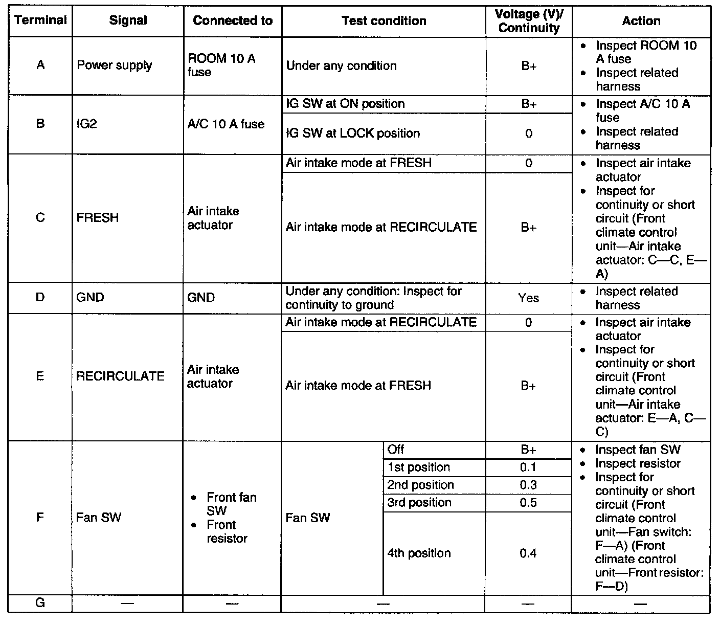 2. Measure the voltage at each front climate control unit terminal and refer to the terminal voltage list.