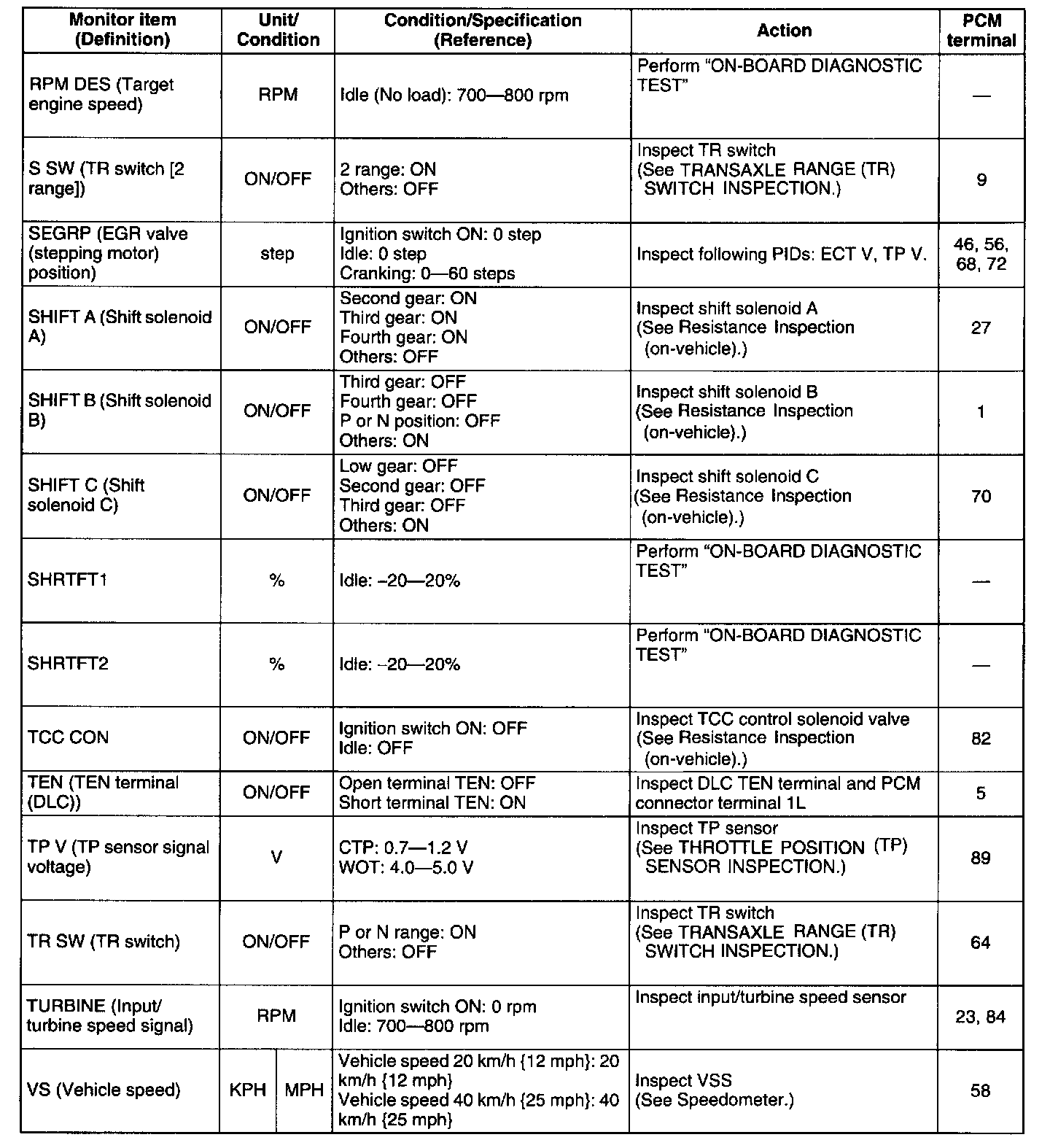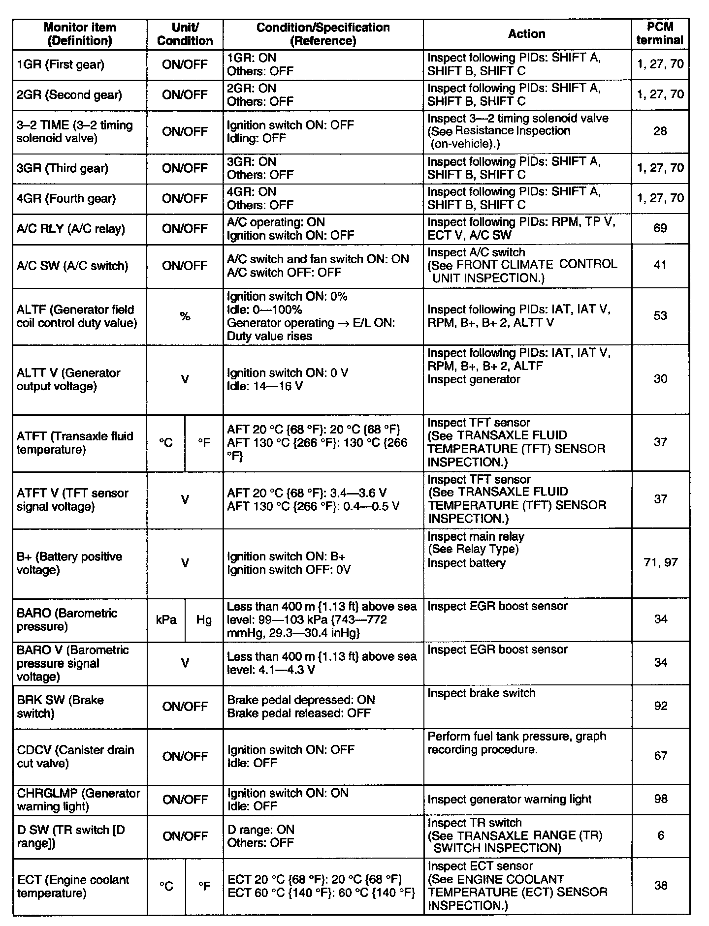 PID/DATA MONITOR table (Reference)