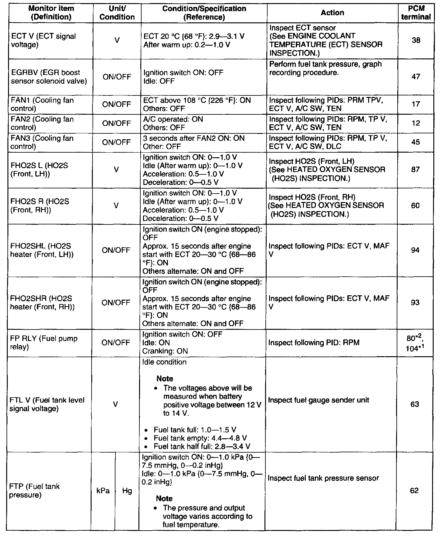 - If PID value is not within the specification, follow the instructions in Action column.