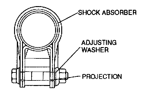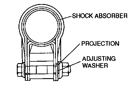 ^ In case of adjusting to + (positive) side, install the adjusting bolt and washer so that the projection of the washer faces inside (shock absorber side) as shown.