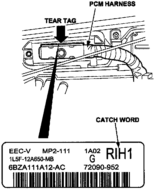 PCM engineering number, calibration number and catch word number are found on the PCM plastic electrical connector (i.e. PCM engineering number 1L5F-12A650-MB, Catch Word number RIH1). The catch word number may also be found on the right front fender near where the fender meets the cowl, or directly behind washer fluid bottle.