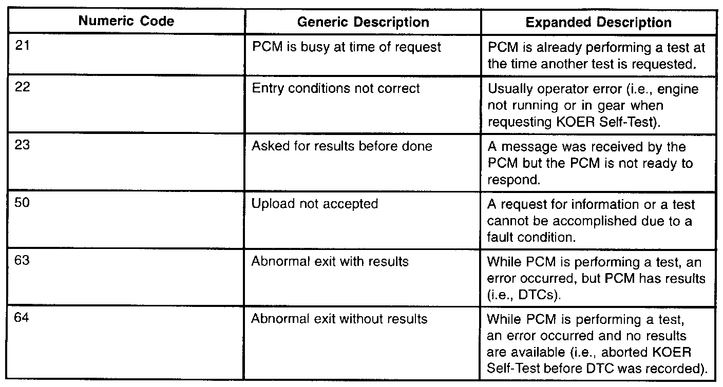 It is possible to receive a communication error from a NGS Tester when initiating a diagnostic test or accessing PIDs. The communication error can be caused by operator error, the vehicle wiring, connectors, the PCM or other control modules connected to the DLC wiring. The PCM will respond to a NGS Tester whenever the tool requests a test. These are not DTCs. Listed in the table are numeric codes and generic descriptions that a scan tool may display when trying to perform some PCM operations. It is possible to get other numeric codes not listed. For a complete list of communication response codes, Refer to Society of Automotive Engineers (SAE) document J2190 enhanced E/E Diagnostic Test Modes. Some are normal responses to valid requests. The others are communication error responses. If the tool displays any of the communication error responses check scan tool connections, cable/adapters and entry of vehicle information.