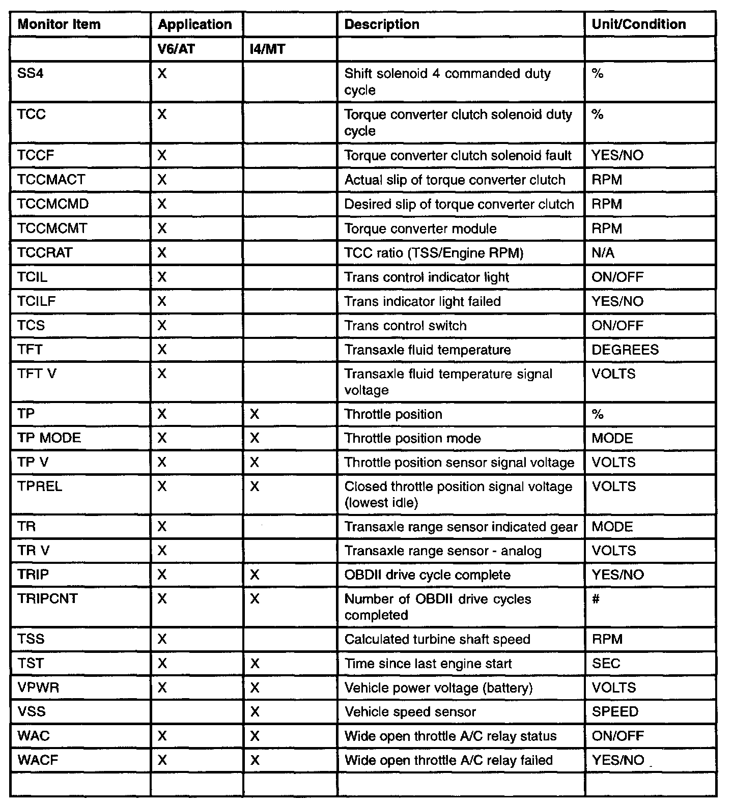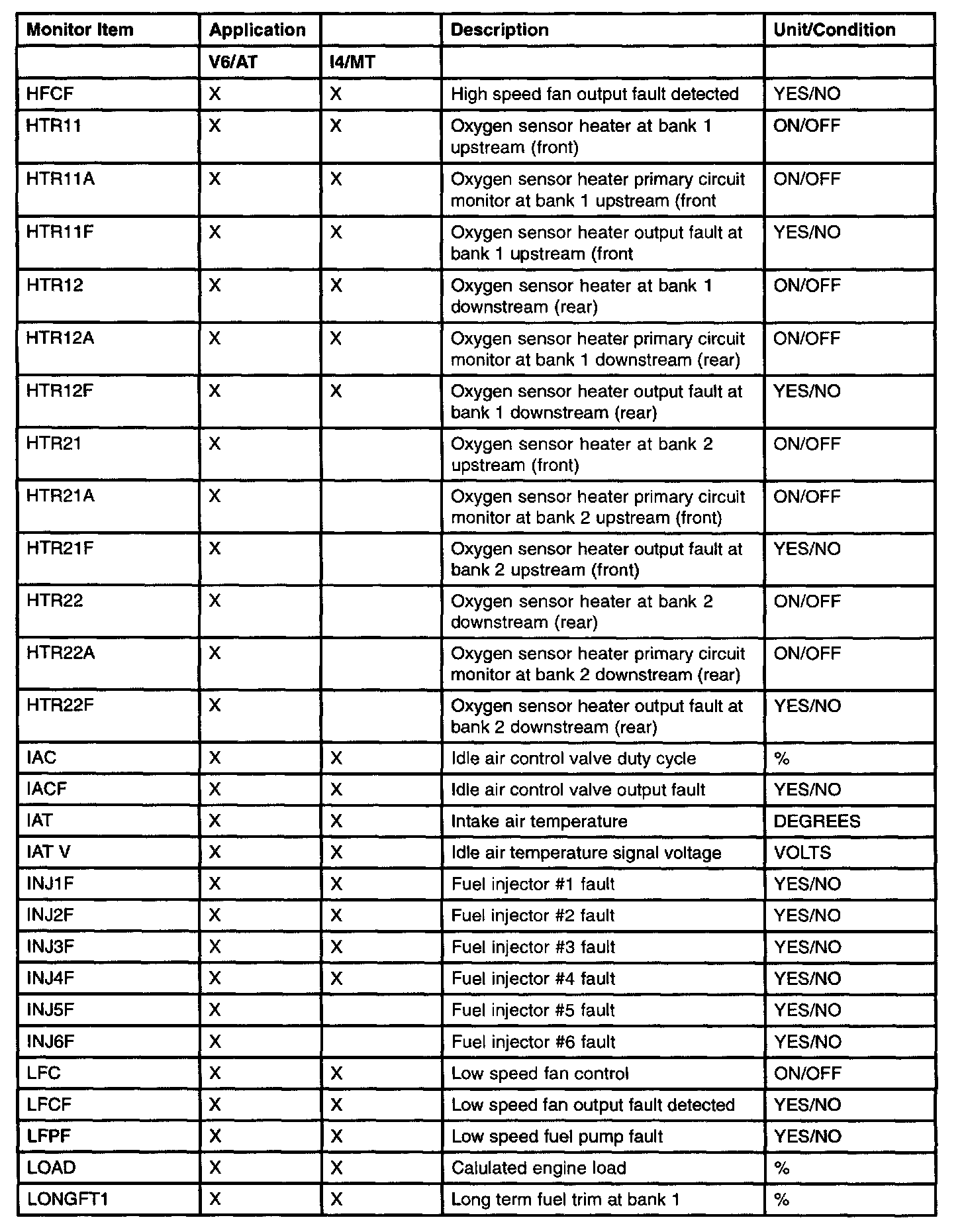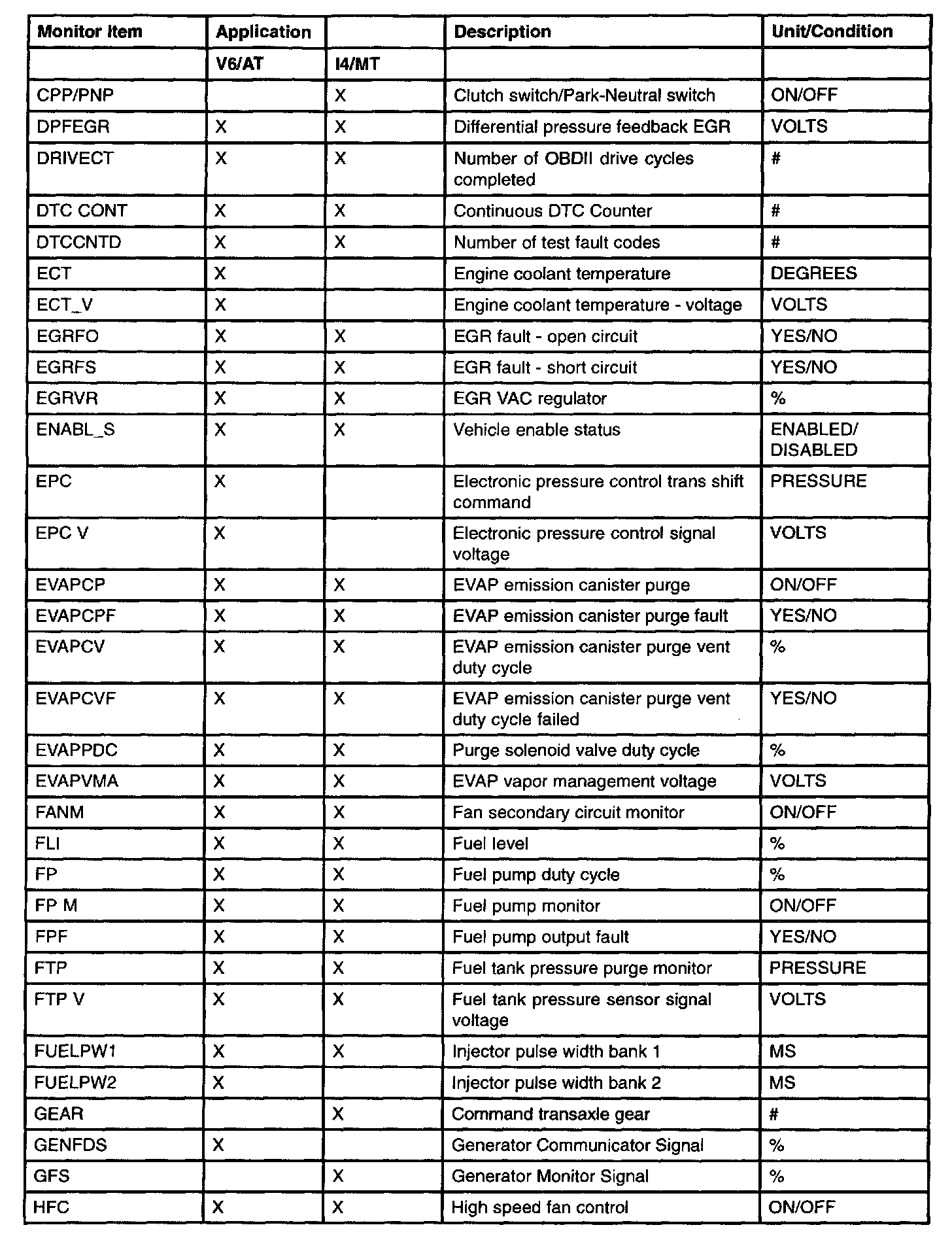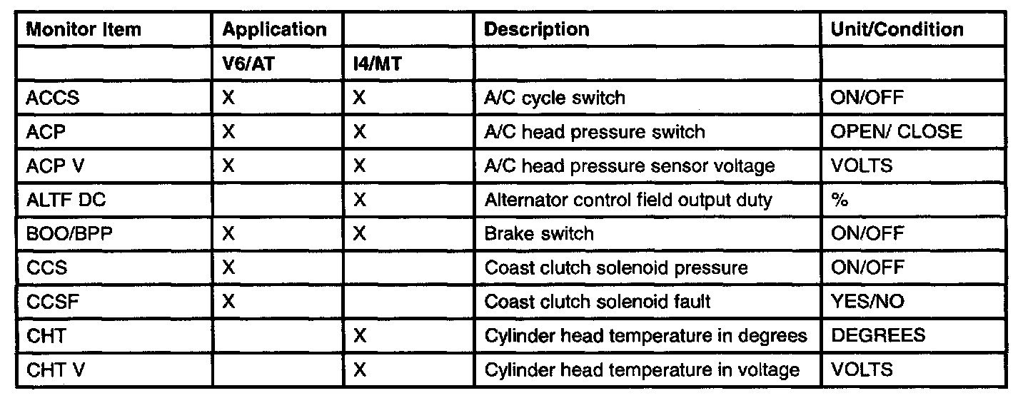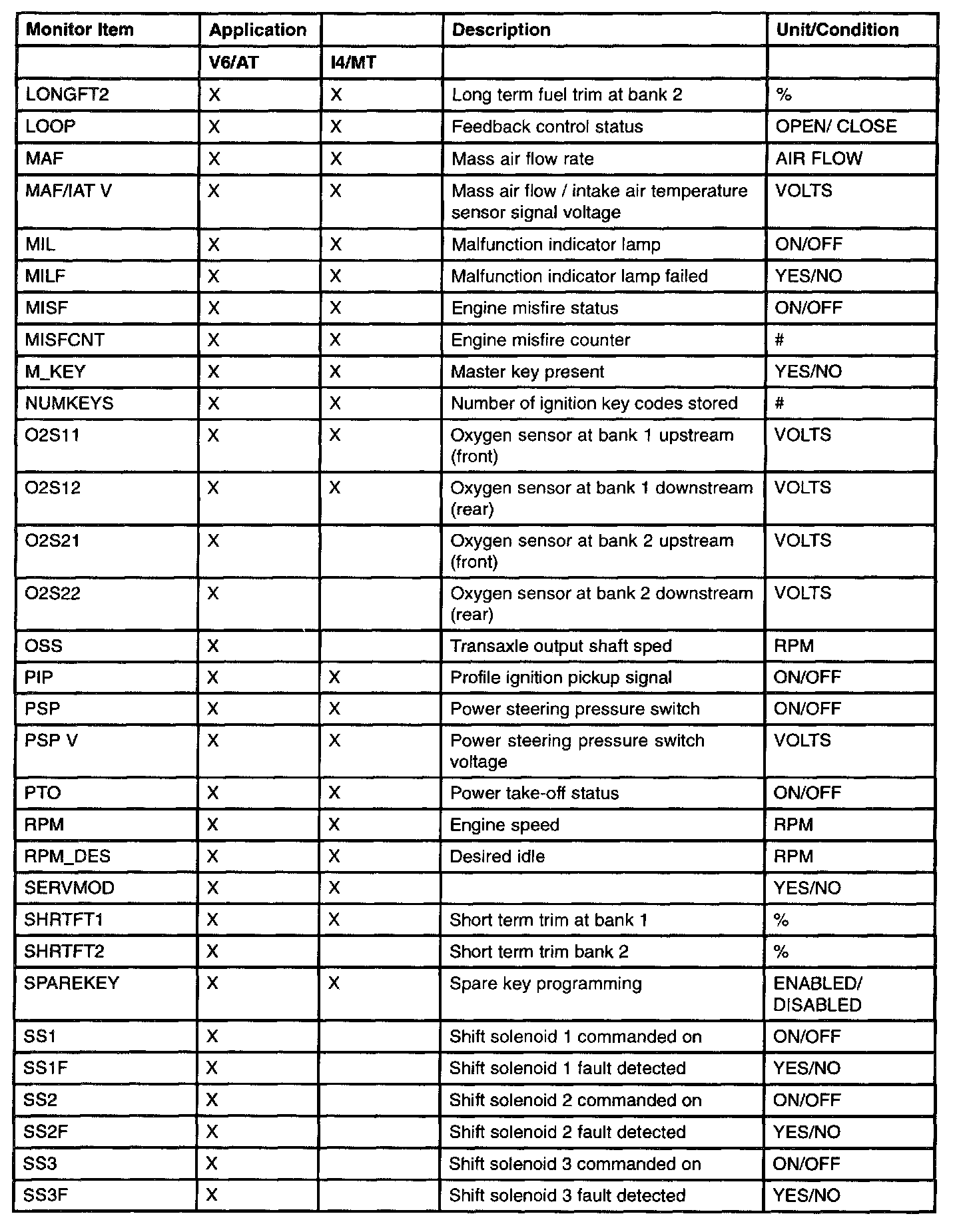 Home >> Mazda >> 2001 >> Tribute DX 2WD L4-2.0L >> Repair and Diagnosis >> Powertrain Management >> Computers and Control Systems >> Testing and Inspection >> Scan Tool Testing and Procedures >> Data Monitor Procedure >> PID/Data Monitor Item Table