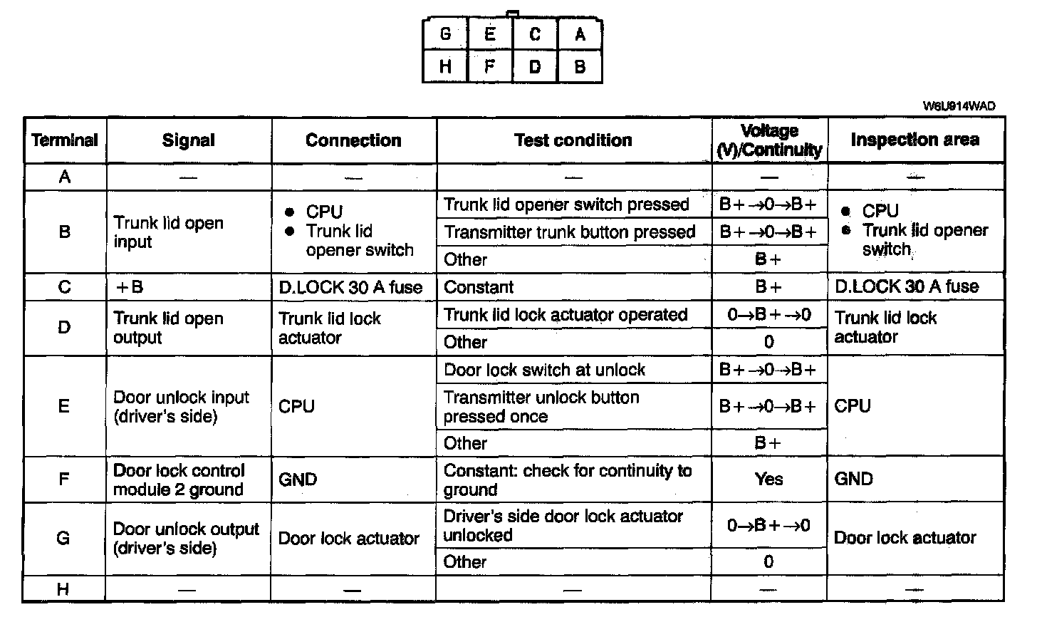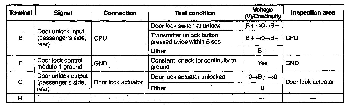 DOOR LOCK CONTROL MODULE 1 INSPECTIONNOTE: Disconnect the door lock control module 1 connector before checking for continuity at terminal F.