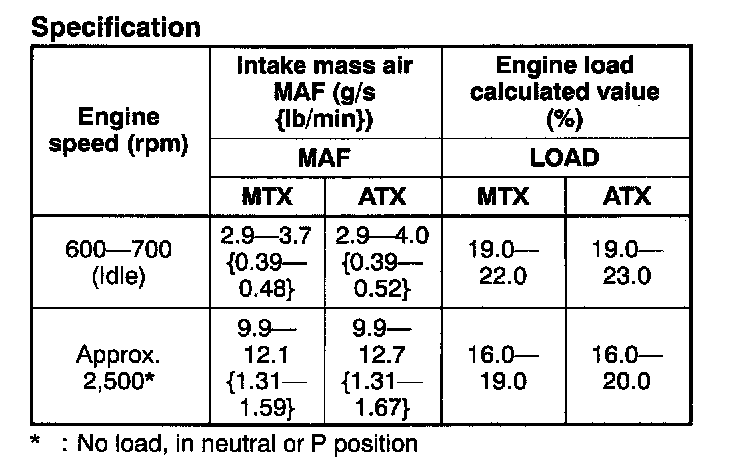 - Mass air flow sensor terminal C voltage: Below 1.0 V