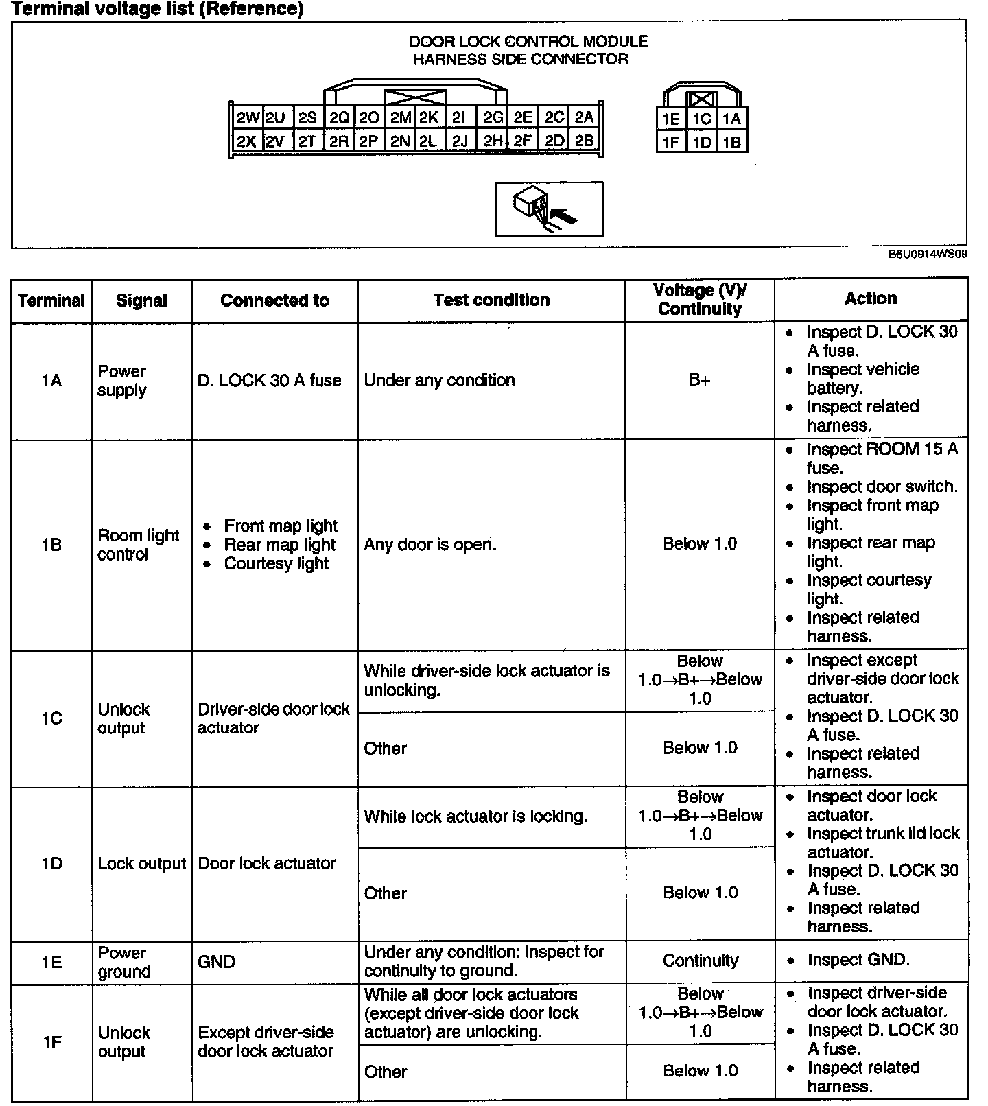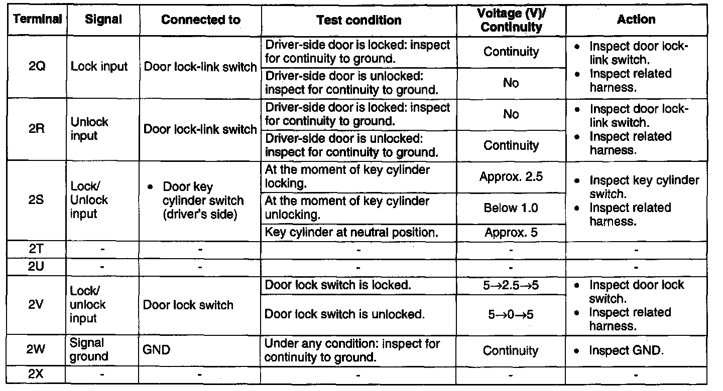 DOOR LOCK CONTROL MODULE INSPECTION1. Measure the voltage at the door lock control module terminals (other than terminals 1E, 2G, 2K and 2W) as indicated.