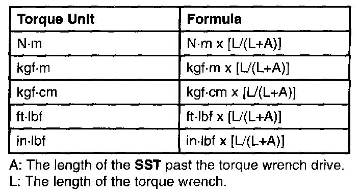When using a torque wrench-SST combination, the written torque must be recalculated due to the extra length that the SST adds to the torque wrench.