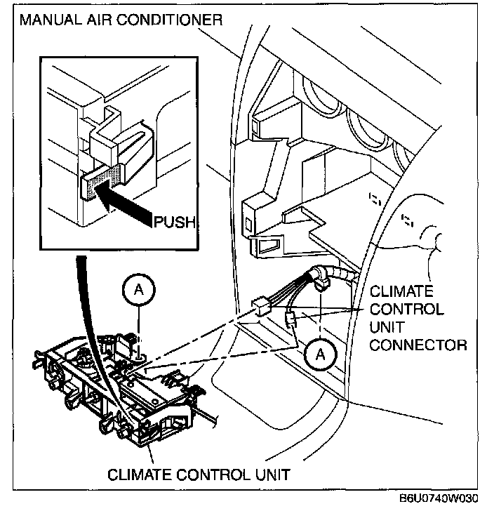 6. Disconnect the climate control unit connectors and remove the climate control unit. (Manual air conditioner)