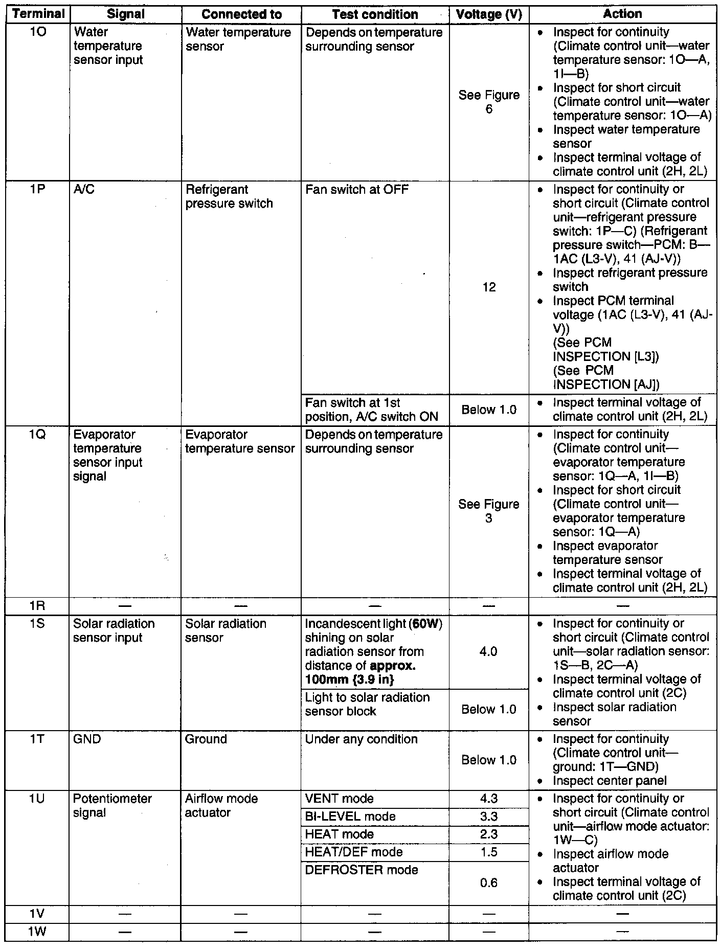 3. Measure the voltage at each climate control unit terminal and refer to the terminal voltage list.