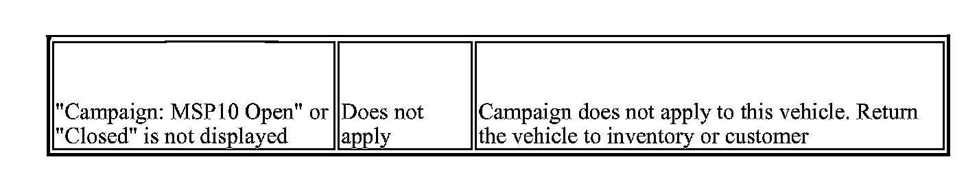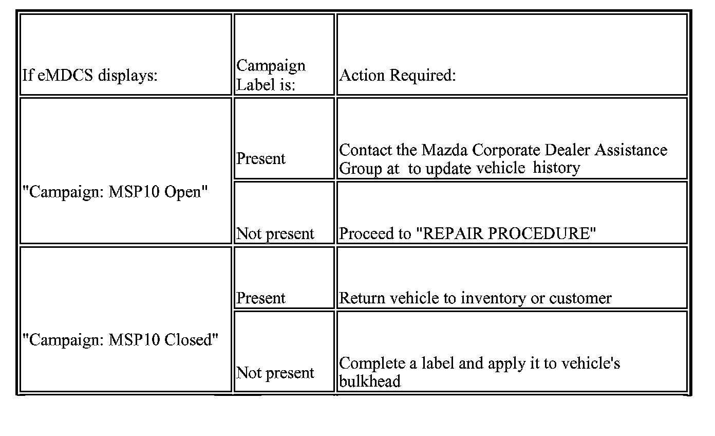 ^ BEFORE PERFORMING ANY REPAIR, VALIDATE THAT THE VEHICLE IS APPLICABLE TO THIS PROGRAM BY PERFORMING AN "eMDCS WARRANTY VEHICLE INQUIRY" AND VERIFYING THE VEHICLE DISPLAYS CAMPAIGN "MSP10". SEE "VEHICLE