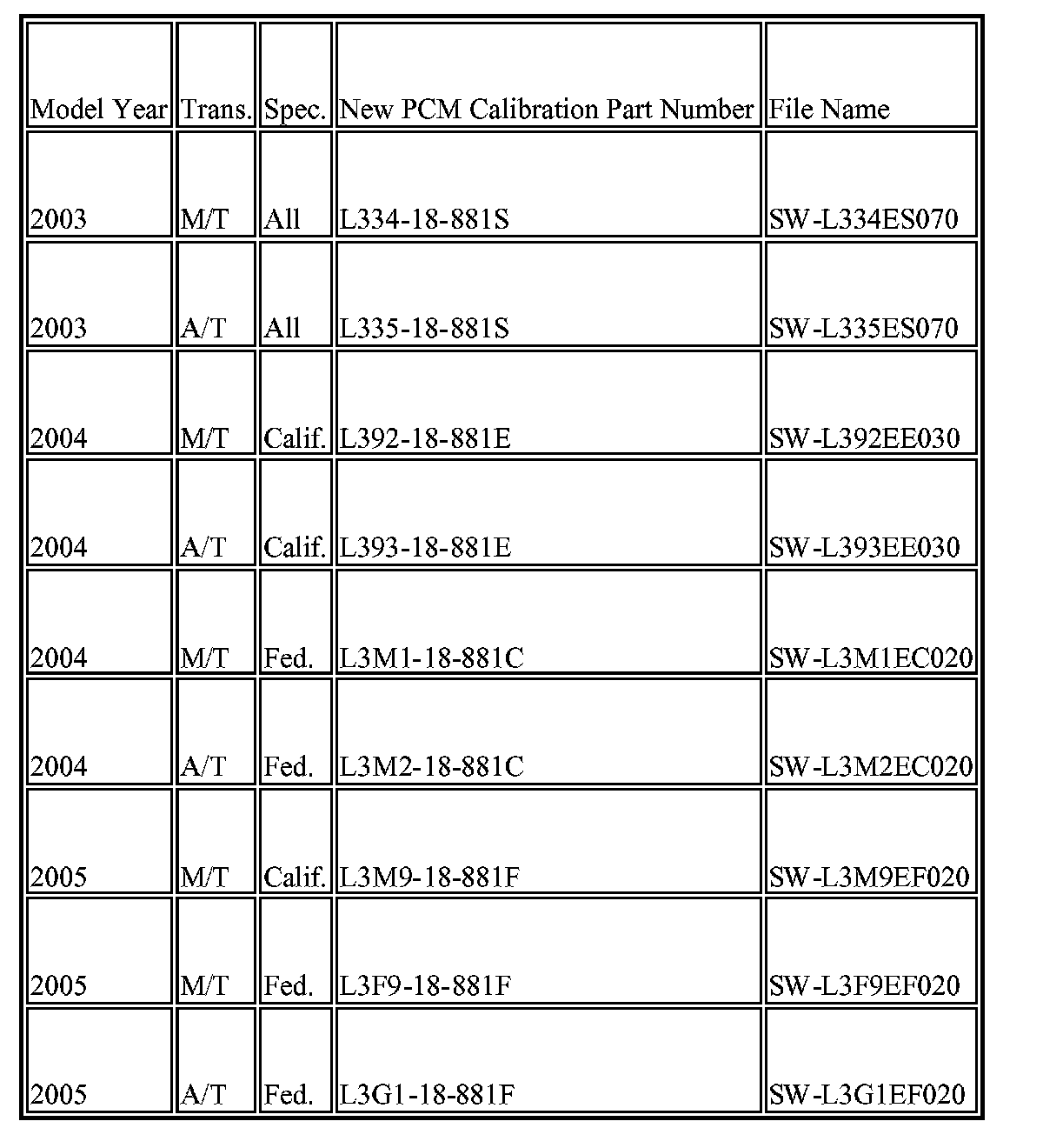 The PCM and TCM Calibration Part Numbers listed above are provided for PCM and TCM reprogramming purposes only. These are not necessarily the same Mazda part numbers used to order an actual PCM or TCM through the Mazda Parts System. It is not necessary to order a PCM or TCM as part of this repair procedure.