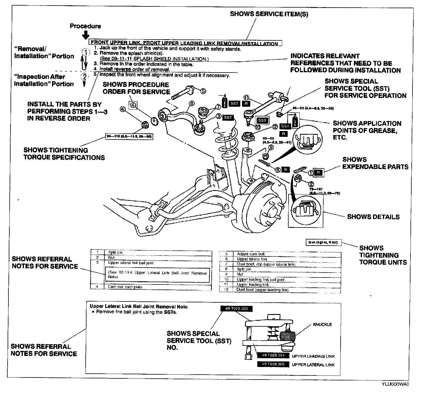 2. Expendable parts, tightening torques, and symbols for oil, grease, and sealant are shown in the overview illustration. In addition, symbols indicating parts requiring the use of special service tools or equivalent are also shown.