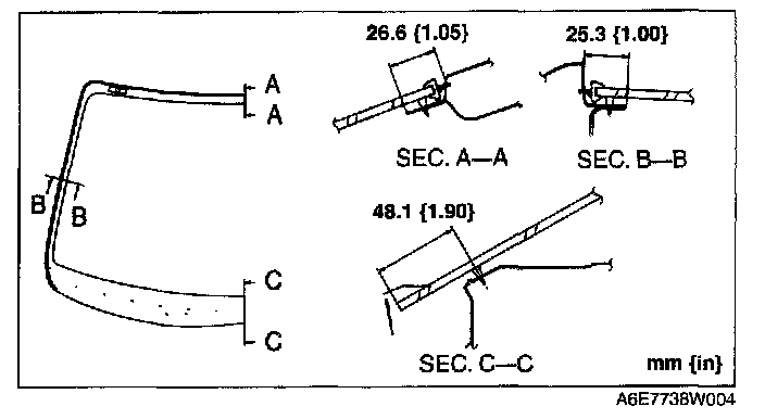 5. If installing reused glass, align the windshield molding marking and the center of the upper section of the windshield, then install the molding to the windshield.