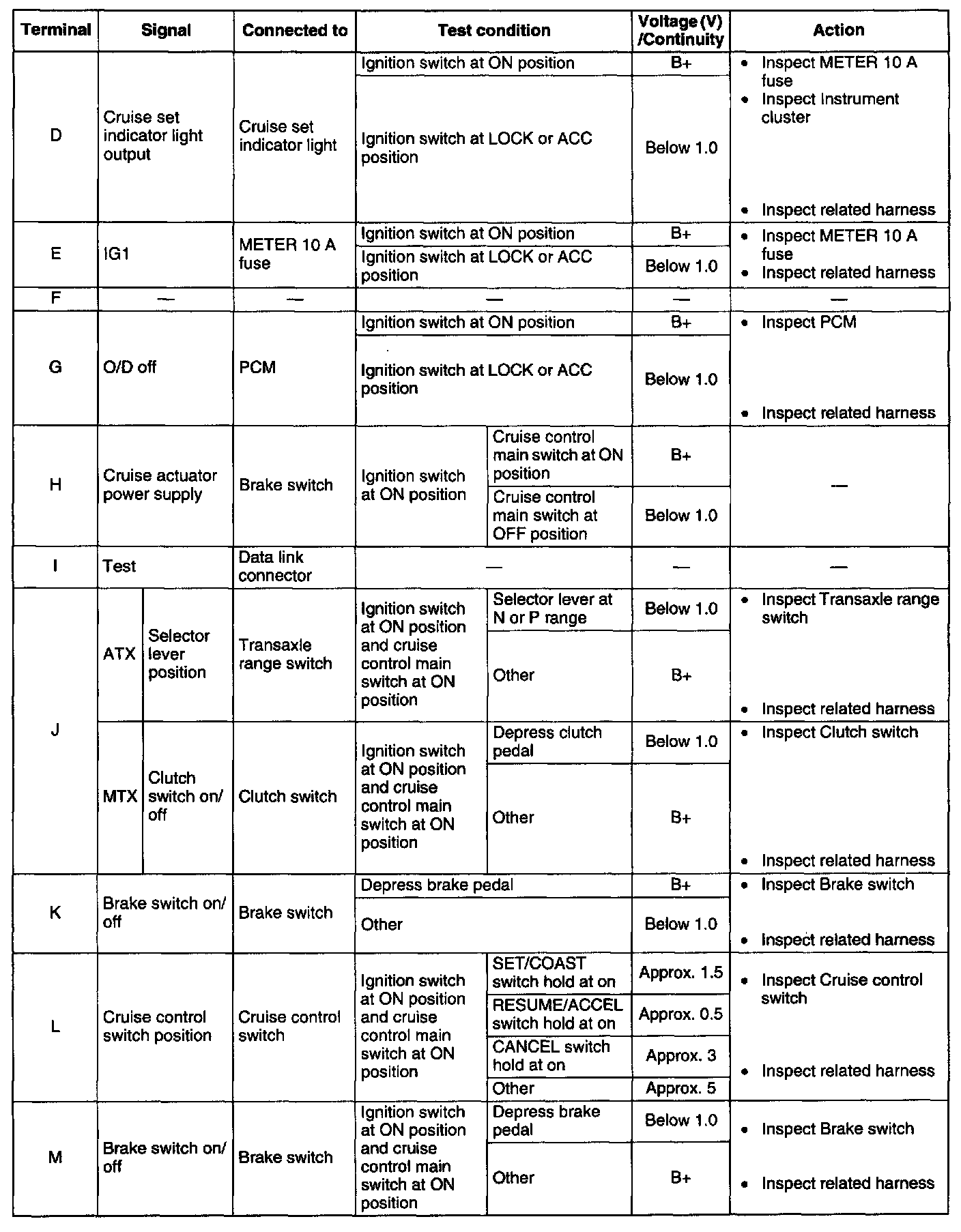 3. Measure the voltage at the cruise control module terminals as indicated.
