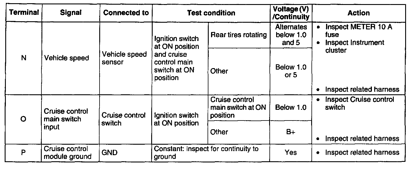 4. Disconnect the cruise control module connector before inspecting for continuity at terminal P.