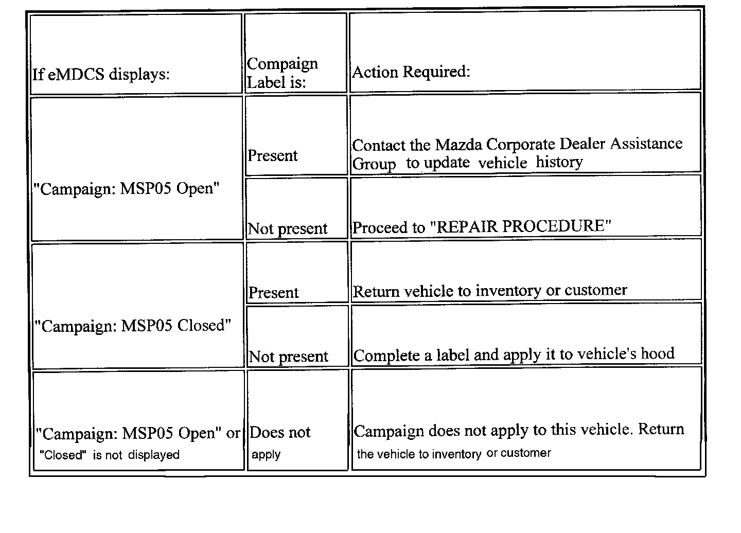 ^ BEFORE PERFORMING ANY REPAIR, VALIDATE THAT THE VEHICLE IS APPLICABLE TO THIS PROGRAM BY PERFORMING AN "eMDCS WARRANTY VEHICLE INQUIRY" AND VERIFYING THE VEHICLE DISPLAYS CAMPAIGN "MSPO5". SEE "VEHICLE INSPECTION PROCEDURE" BELOW.