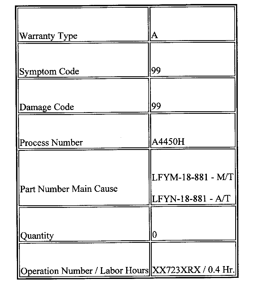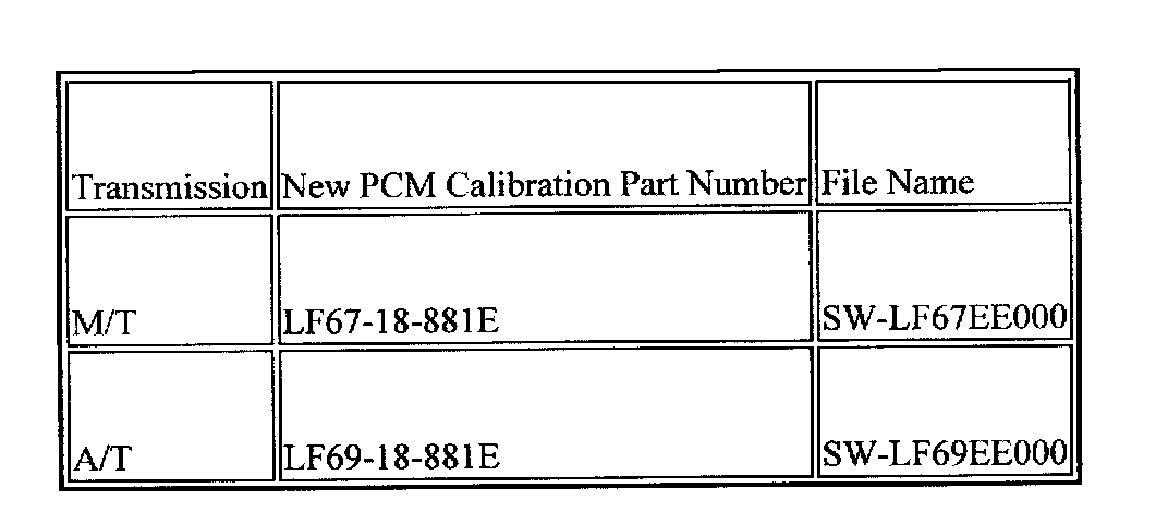 The PCM Calibration Part Numbers listed above are provided for PCM reprogramming purposes only. These are not necessarily the same Mazda part numbers used to order an actual PCM through the Mazda Parts System. It is not necessary to order a PCM as part of this repair procedure.