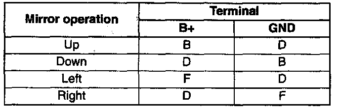 POWER OUTER MIRROR INSPECTION1. Apply battery positive voltage to the power outer mirror terminals and inspect the operation of the power outer mirror.