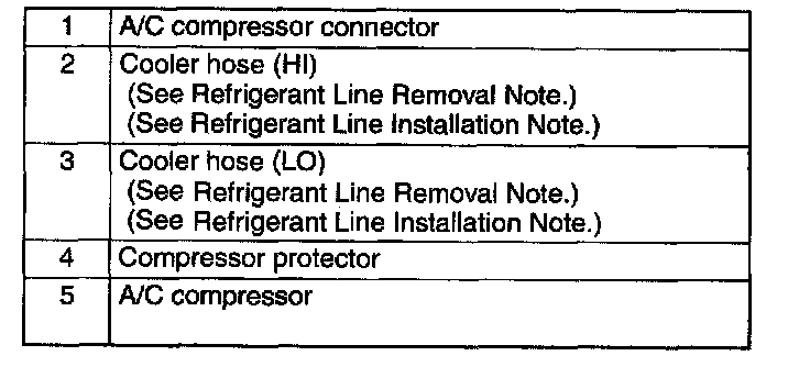 6. Remove in the order indicated in the table. Do not allow remaining compressor oil in the A/C compressor to spill.