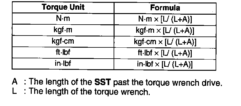 Torque Formulas^ When using a torque wrench SST or equivalent combination, the written torque must be recalculated due to the extra length that the SST or equivalent adds to the torque wrench. Recalculate the torque by using the following formulas. Choose the formula that applies to you.