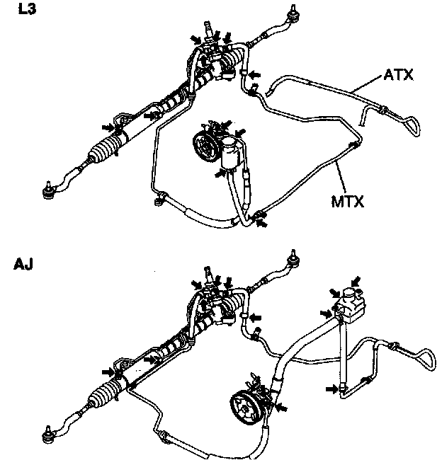 ^ If the steering wheel is kept in the fully turned position for more than 5 seconds, the fluid temperature will rise excessively and adversely affect the oil pump.