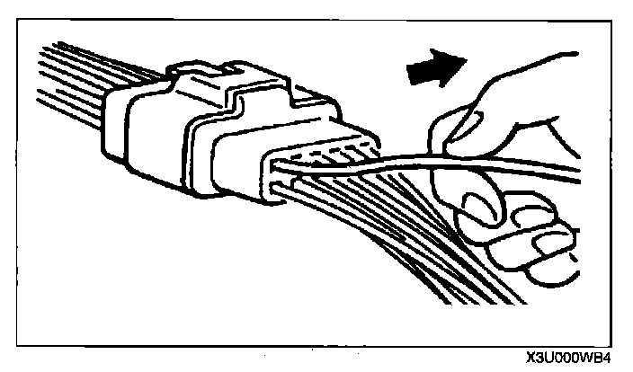 - Insert a thin piece of metal from the terminal side of the connector and with the terminal locking tab pressed down, pull the terminal out from the connector.