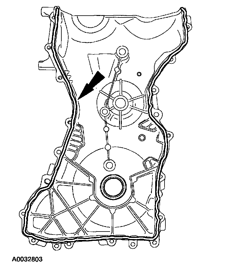 3. Apply a 2.5 mm bead of silicone gasket and sealant to the cylinder head and oil pan joint areas. Apply a 2.5 mm bead of silicone gasket and sealant to the front cover.