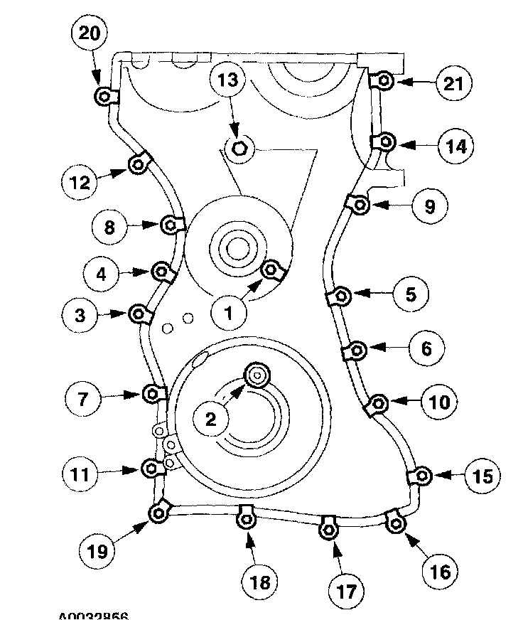 4. Install the front cover Tighten the bolts in the sequence, to the following specifications: Tighten the 8 mm bolts to 10 Nm (1 kgf-cm, 7 lbs.).