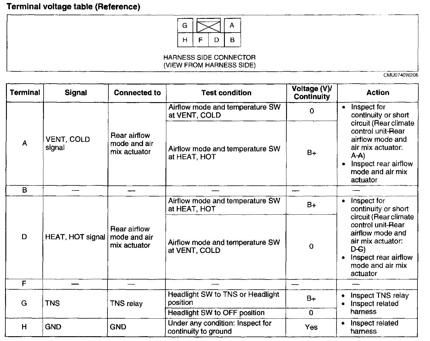 3. Measure the voltage at each rear climate control unit terminal and refer to terminal voltage table.