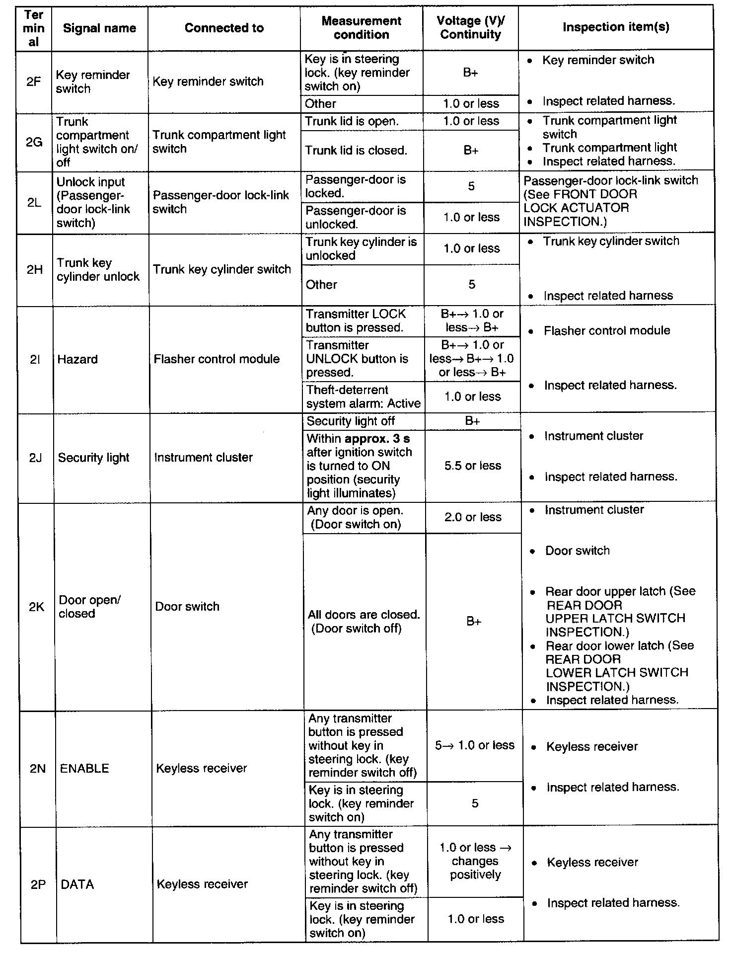 KEYLESS CONTROL MODULE INSPECTION1. Measure the voltage or inspect for continuity according to the Terminal Voltage Table (Reference).