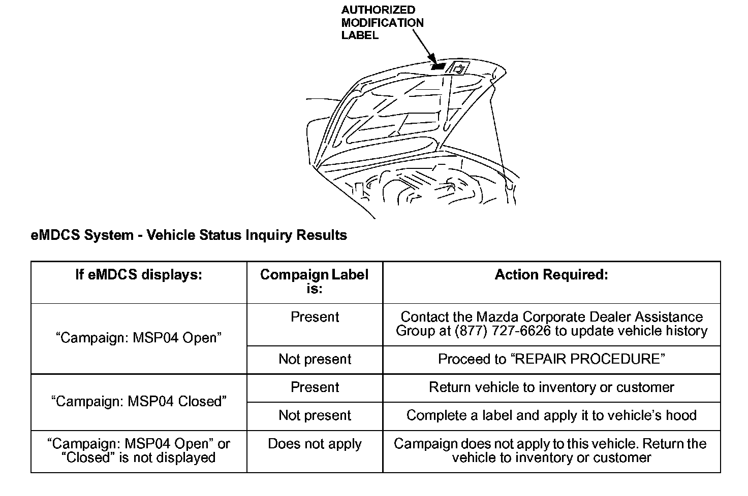 2. Perform a Vehicle Status Inquiry using your eMDCS System and inspect the vehicle for an Authorized Modification Label MSP04 attached to the vehicle's hood.