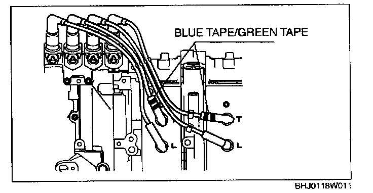CAUTION: Install the high-tension lead with blue and green tape on the trailing side.