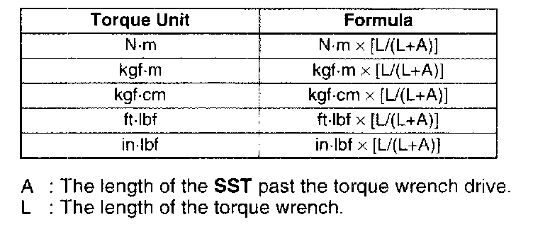Torque Formulas- When using a torque wrench-SST or equivalent combination, the written torque must be recalculated due to the extra length that the SST or equivalent adds to the torque wrench. Recalculate the torque by using the following formulas. Choose the formula that applies to you.