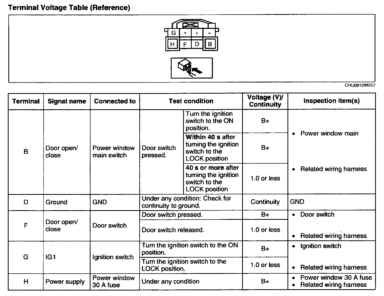 DELAYED POWER CONTROL MODULE INSPECTIONTerminal Voltage Table (Reference):