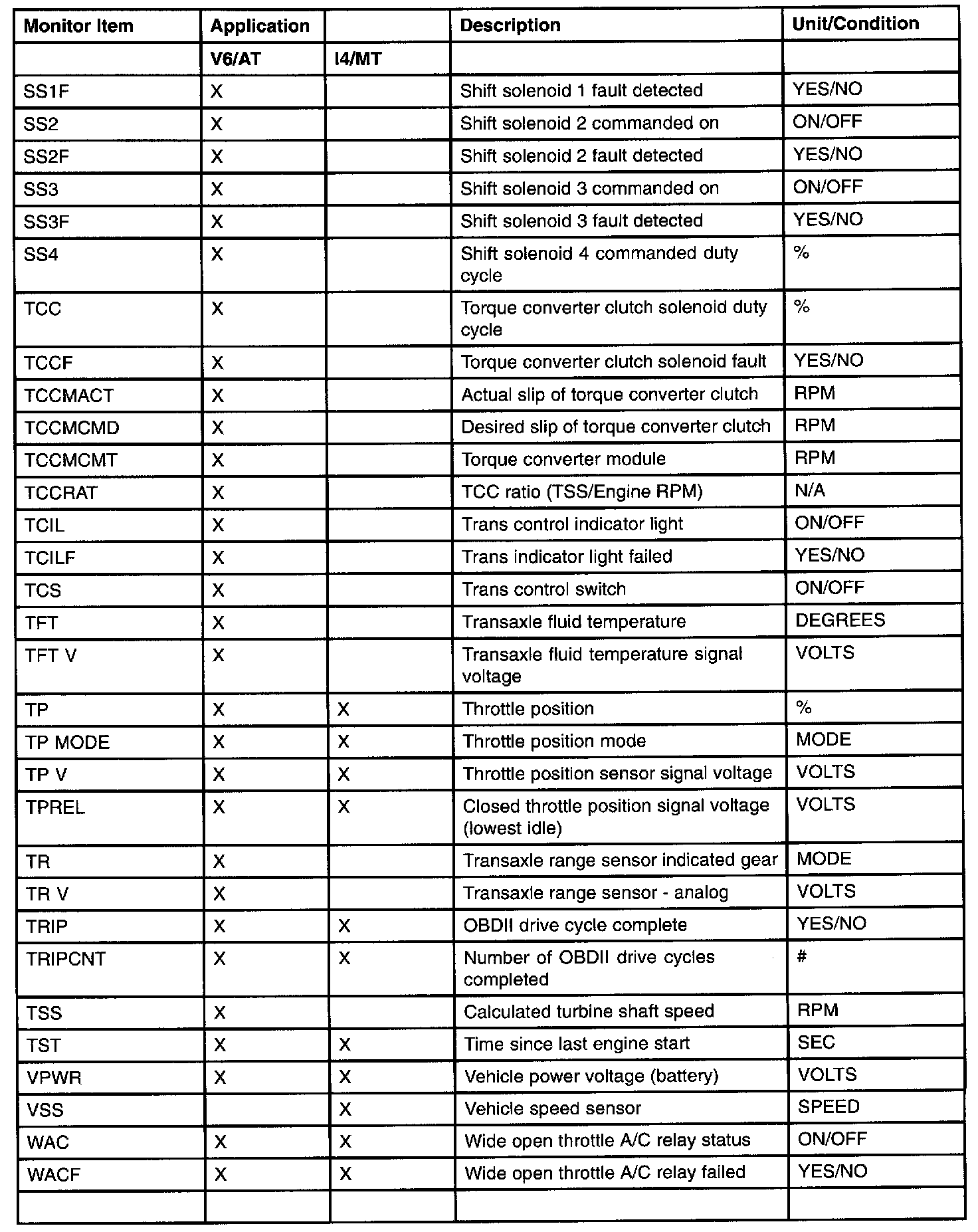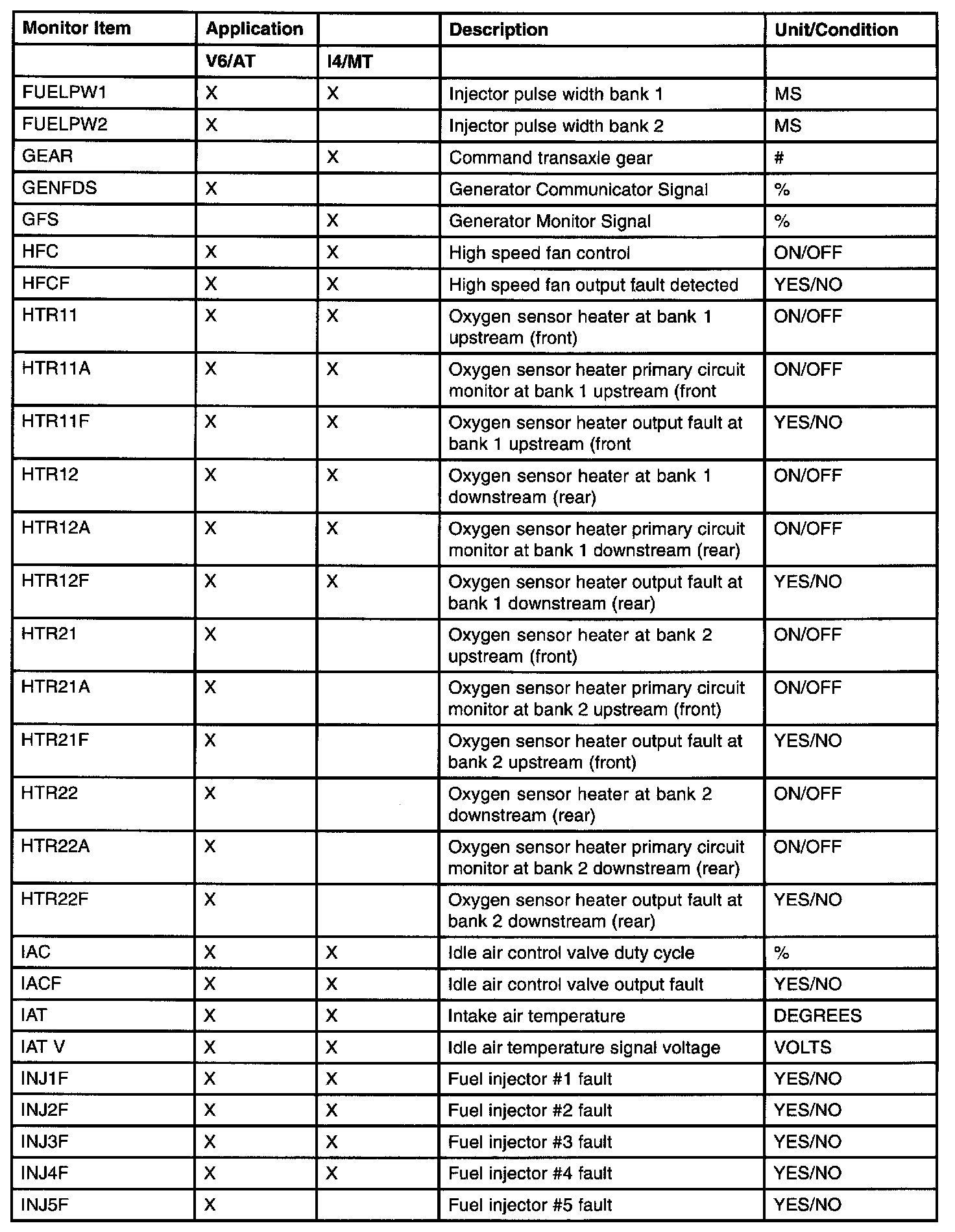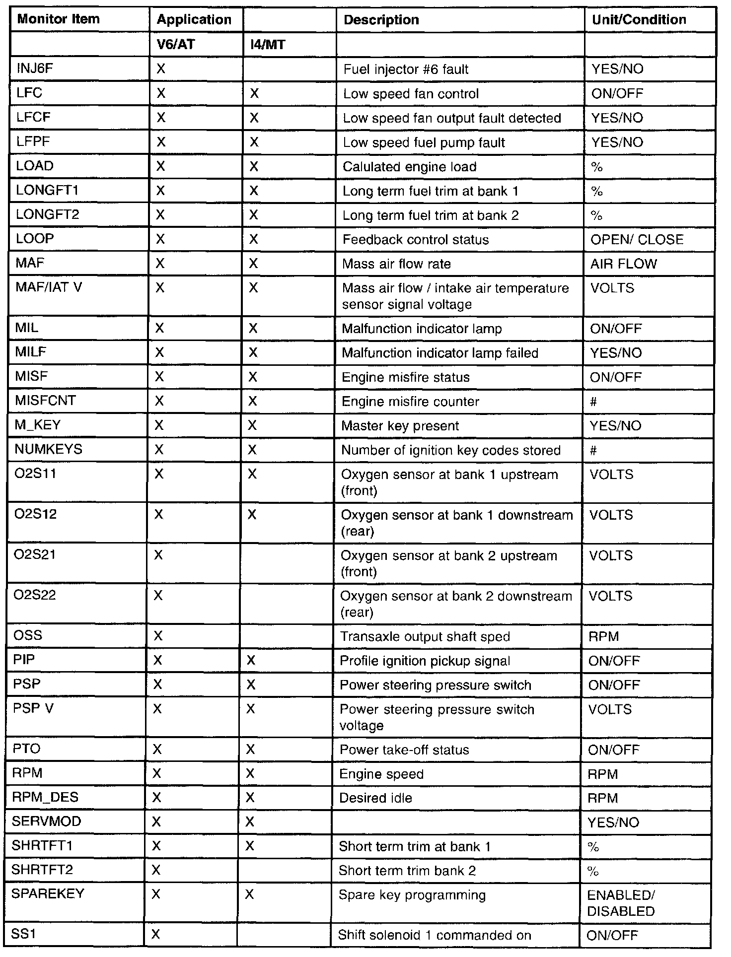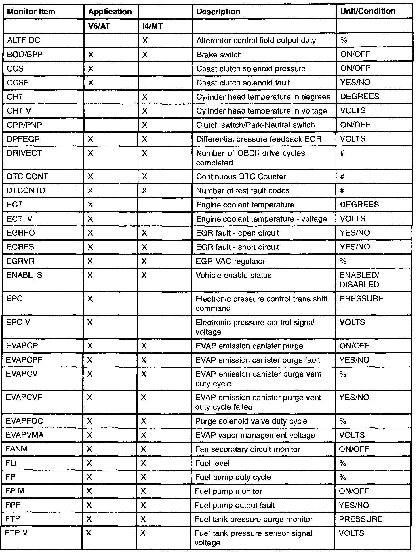 PID/Data Monitor Item Table Part 6: