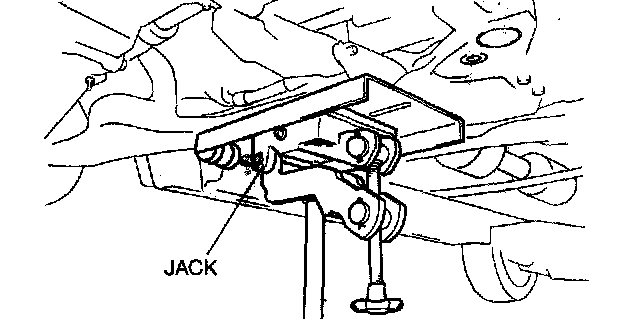 3. Raise the transmission jack gradually and install the front crossmember to the vehicle. At this point verify that the SST is securely inserted in the positioning holes on the body.