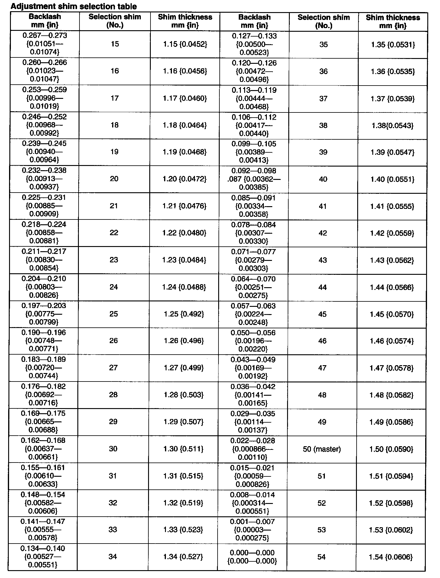 ^ If the backlash exceeds the specified range, remeasure the backlash and, using the adjustment shim selection table, select the proper shim, according to the following procedure.