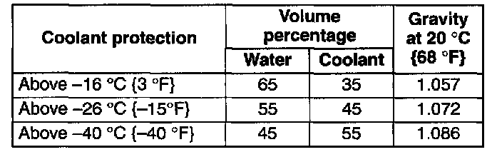 7. Referring to the chart, select proper volume percentage of the water and coolant.