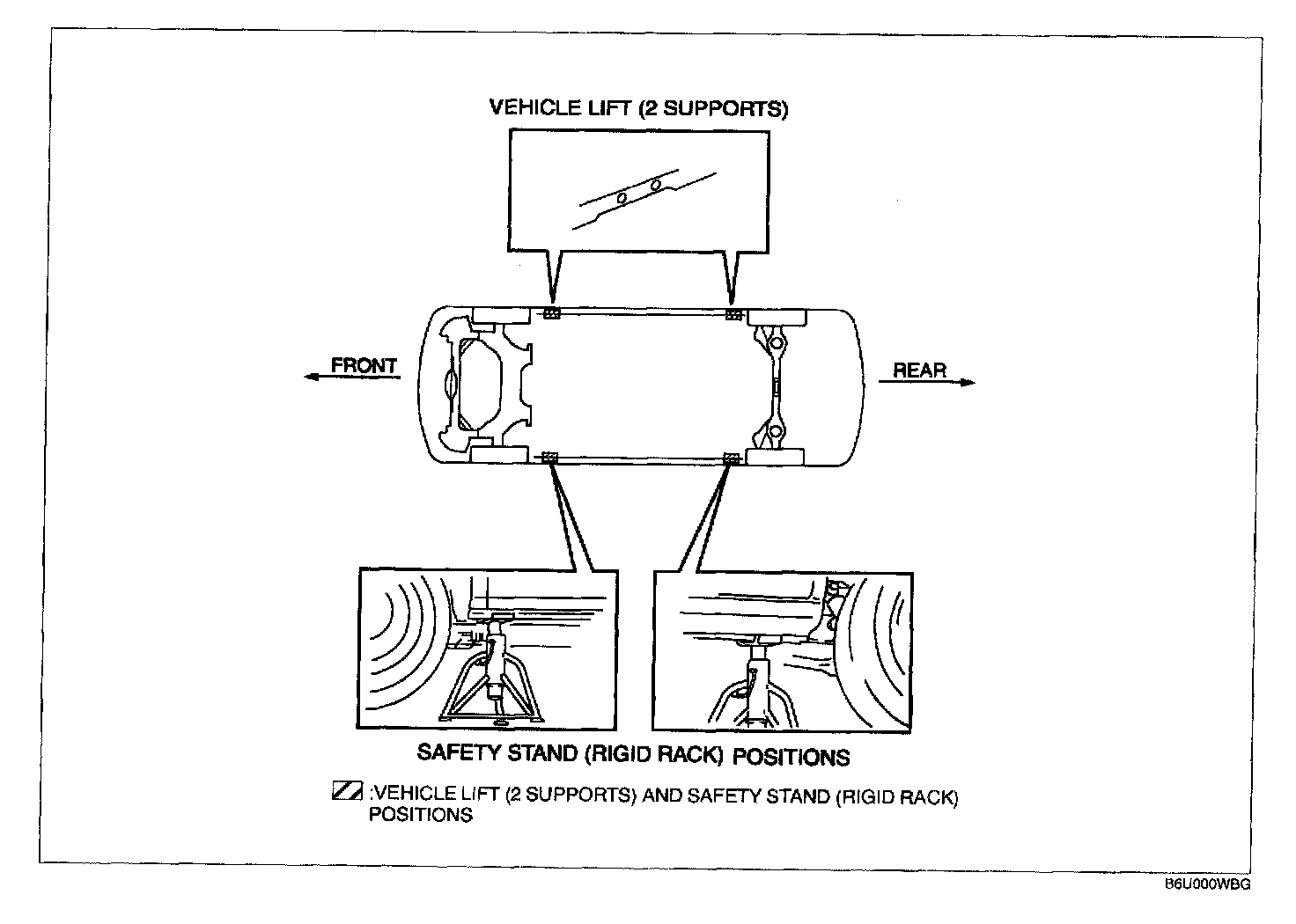 JACKING POSITIONS, VEHICLE LIFT (2 SUPPORTS) AND SAFETY STAND (RIGID RACK) POSITIONSJacking Positions