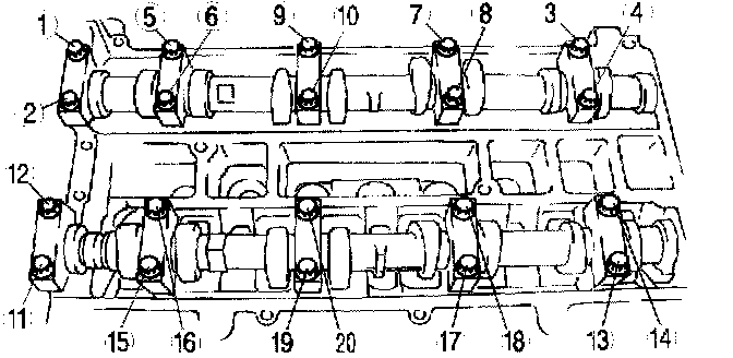 Loosen the camshaft cap bolts in two or three steps in the order shown in the figure