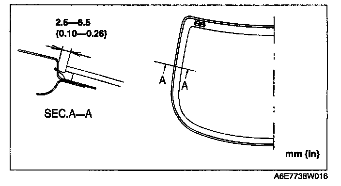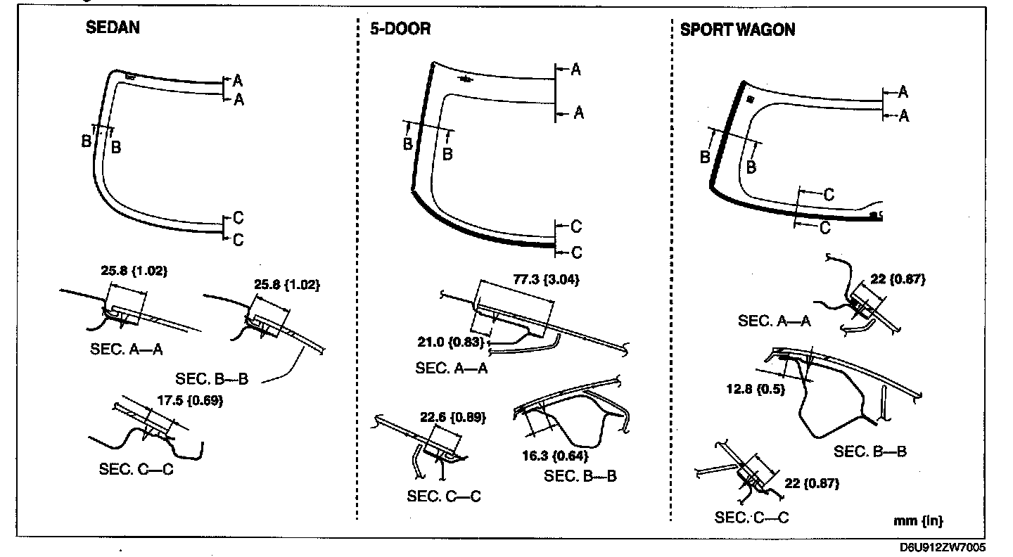 9. Verify that the gap of the upper part is 7.3 mm {0.29 in} and the A pillar part is 6.8 mm {0.27 in}. (Only for Sedan)