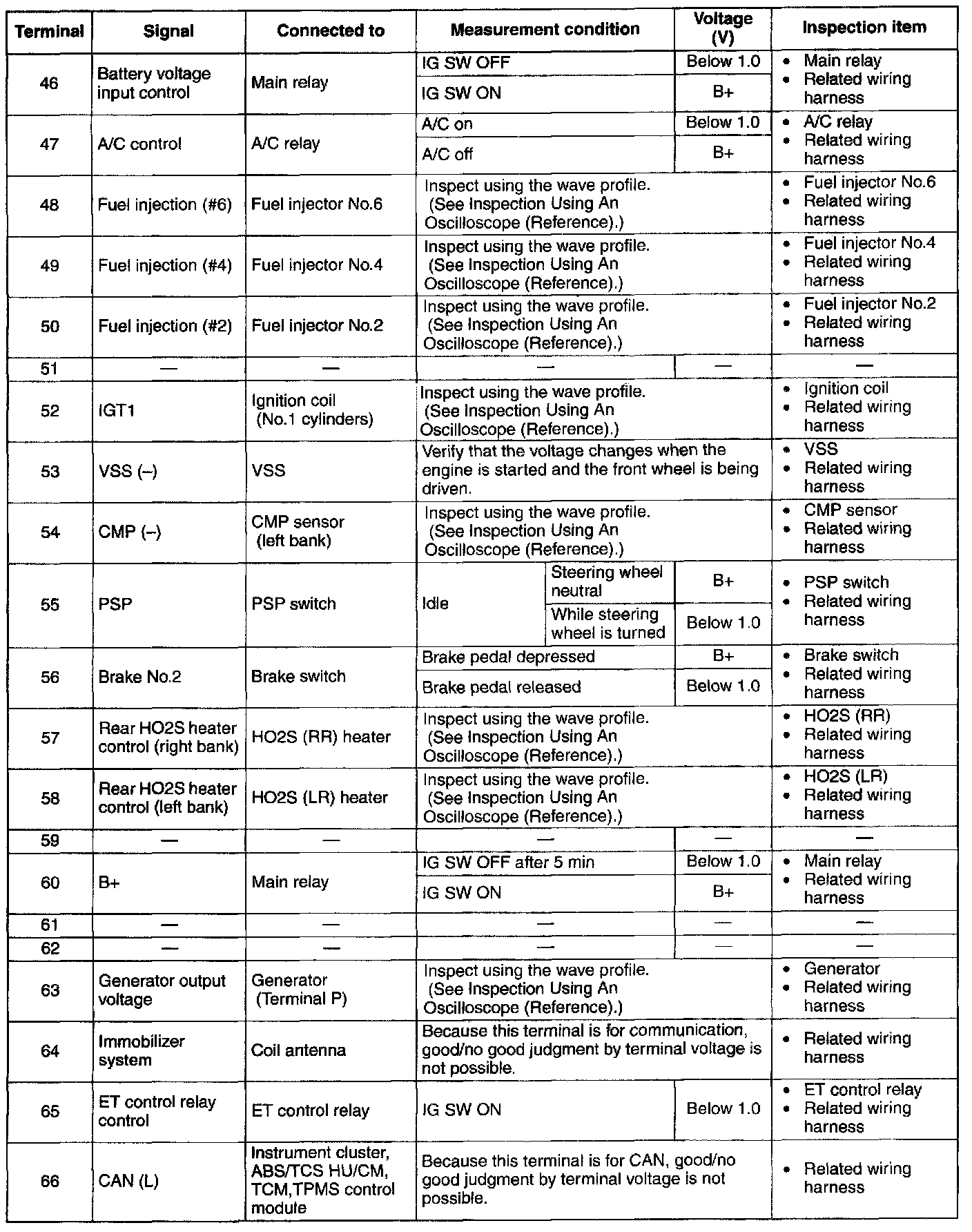 Terminal Voltage Table (Reference) - Terminals (46 - 66):