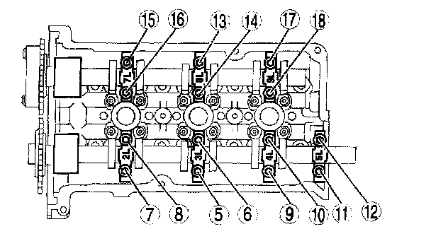 Loosen the remaining bolts 7-8 turns in the indicated sequence to allow the camshaft (LH) to rise
