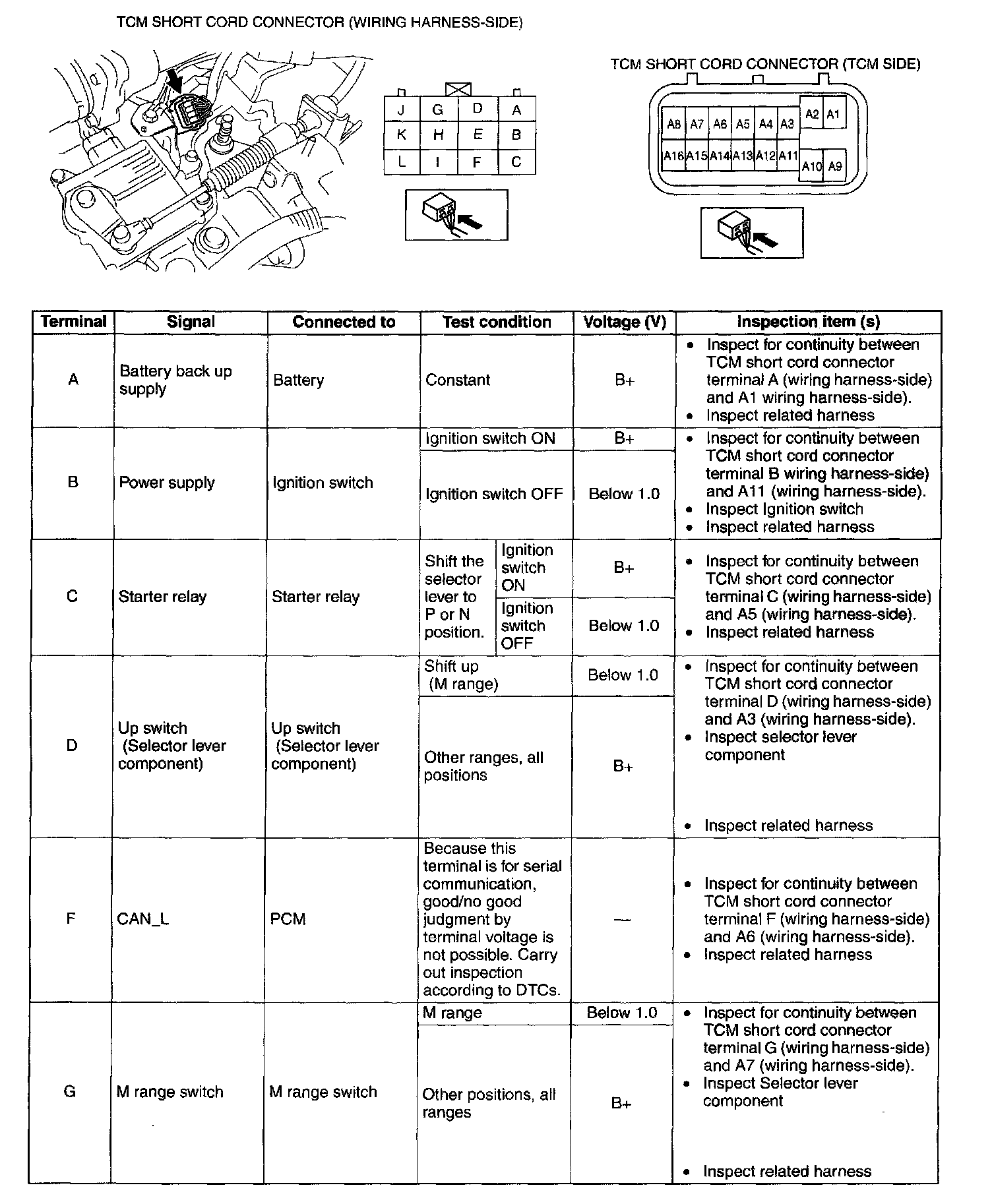 2. Measure the voltage at each TCM short cord connector wiring harness-side) terminal and refer to the terminal voltage table.