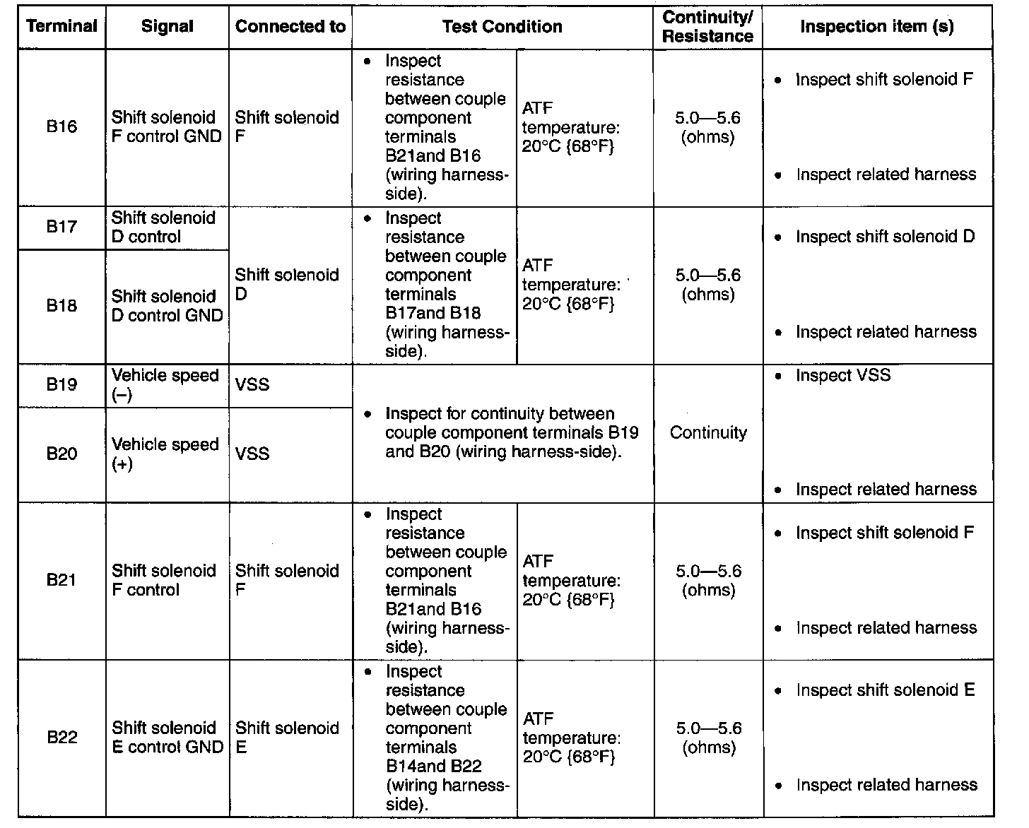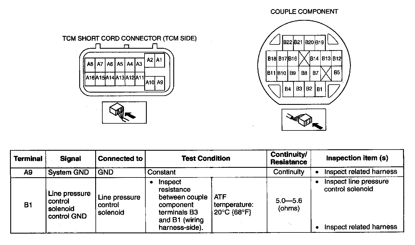 ^ Use the ground of terminal J of the TCM short cord connector wiring harness-side) when measuring terminal voltage, as an error may occur when connecting the negative circuit tester to ground.
