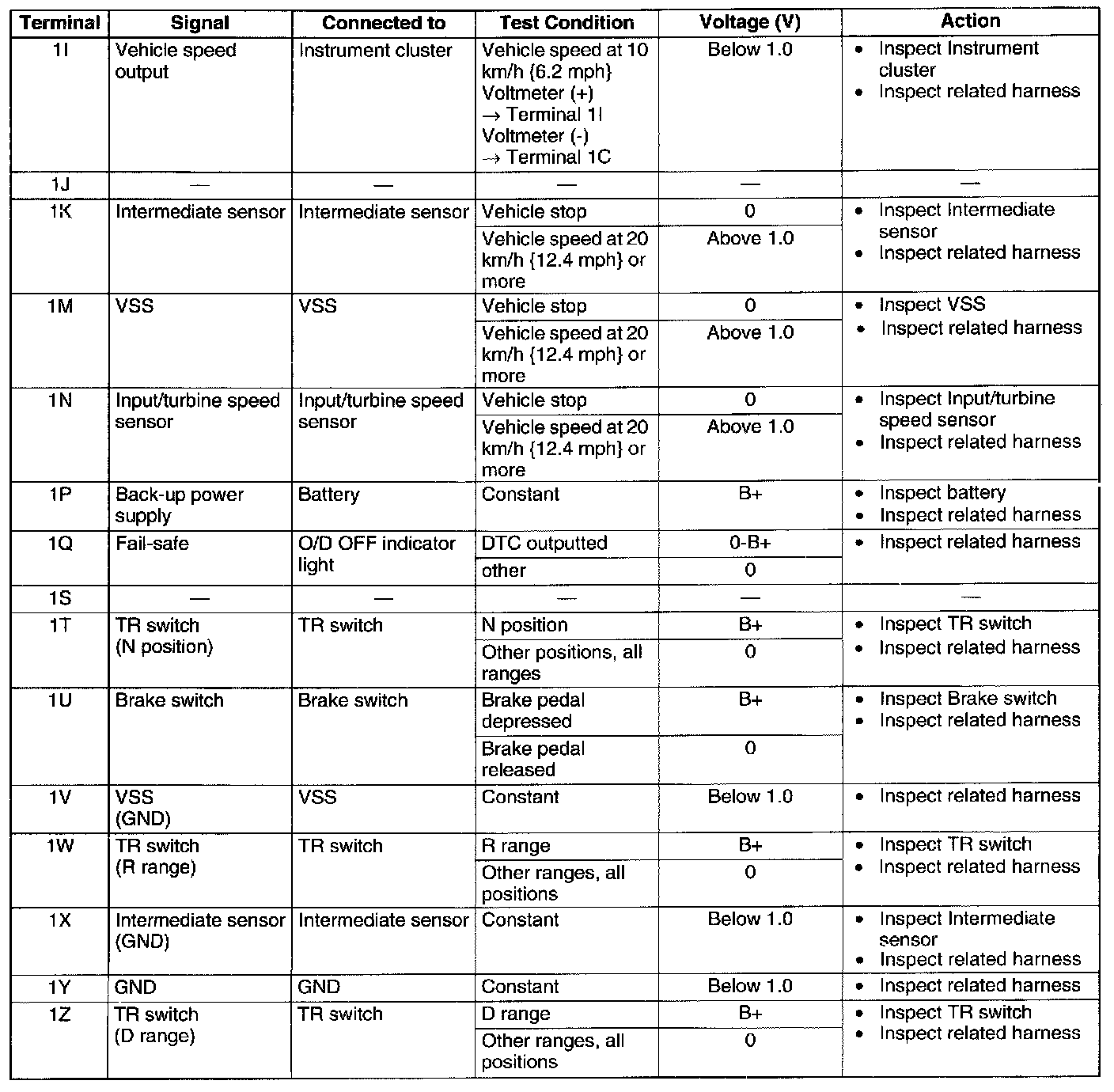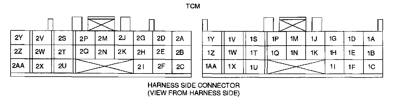 ^ Use the ground of terminal 1C and 1Y of the TCM when measuring terminal voltage, as an error may occur when connecting the negative circuit tester to ground.