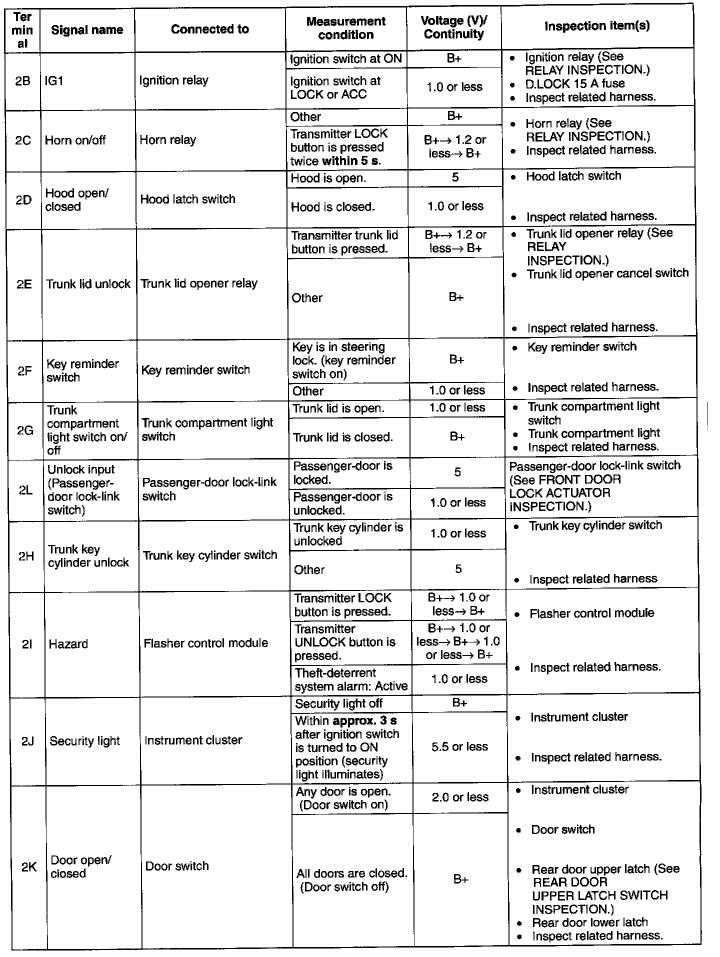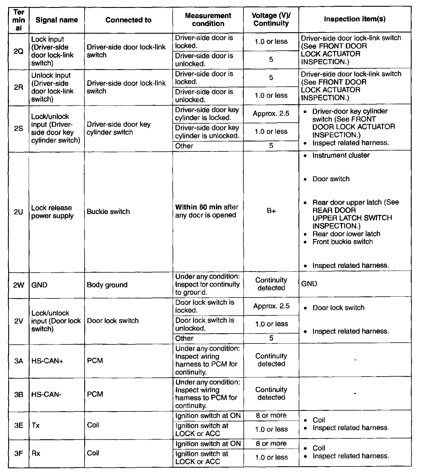 KEYLESS CONTROL MODULE INSPECTION1. Measure the voltage or inspect for continuity according to the Terminal Voltage Table (Reference).