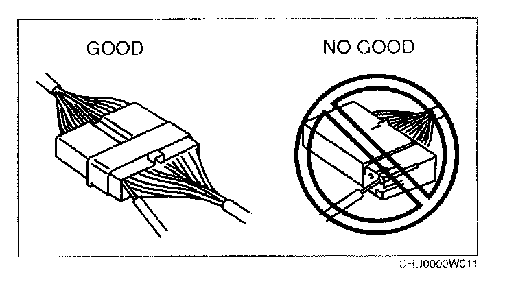 - When a tester is used to inspect for continuity or measuring voltage, insert the tester probe from the wiring harness side.